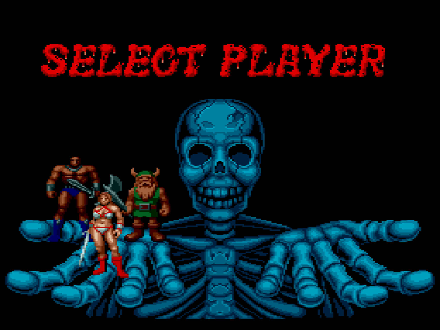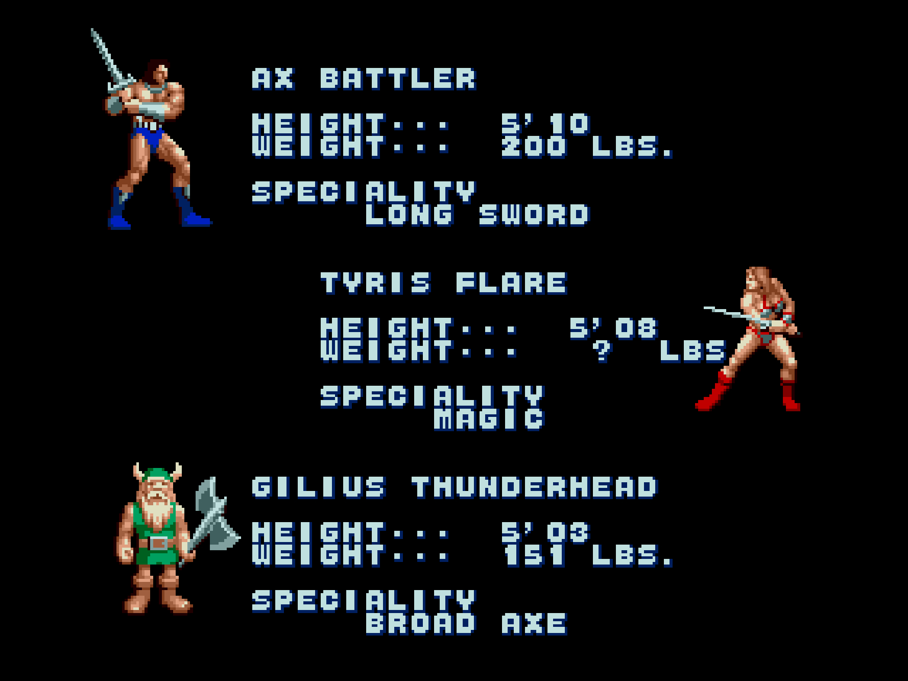 筋肉隆々の青パンツ男の戦士アックス=バトラー、ガチムチのビキニ女戦士ティリス=フレアー、ヒゲ面で大きな斧を扱うドワーフのギリウス・サンダーヘッドと、いずれも個性的な3人の中から選べます!