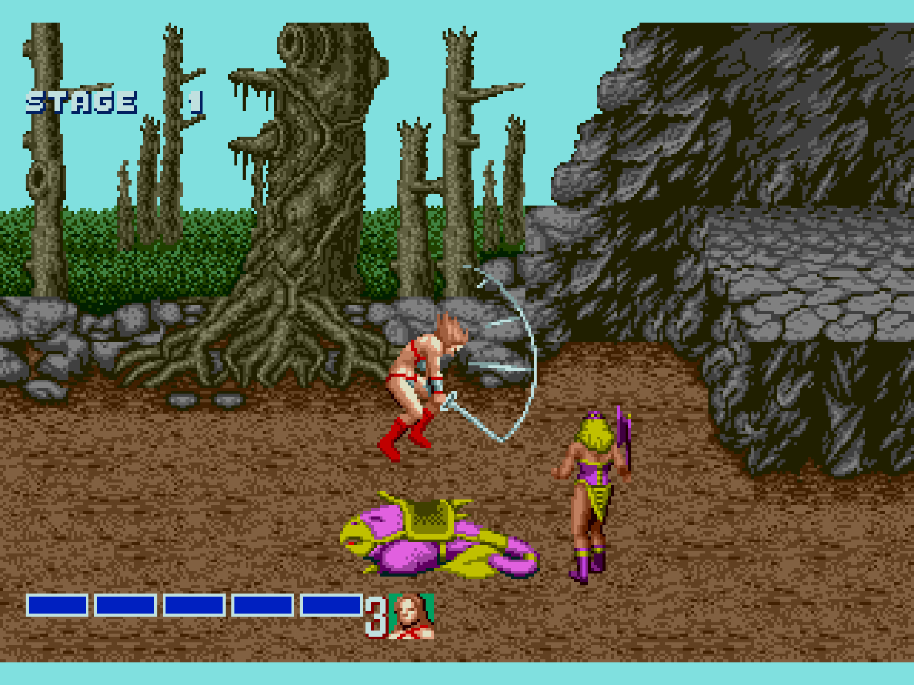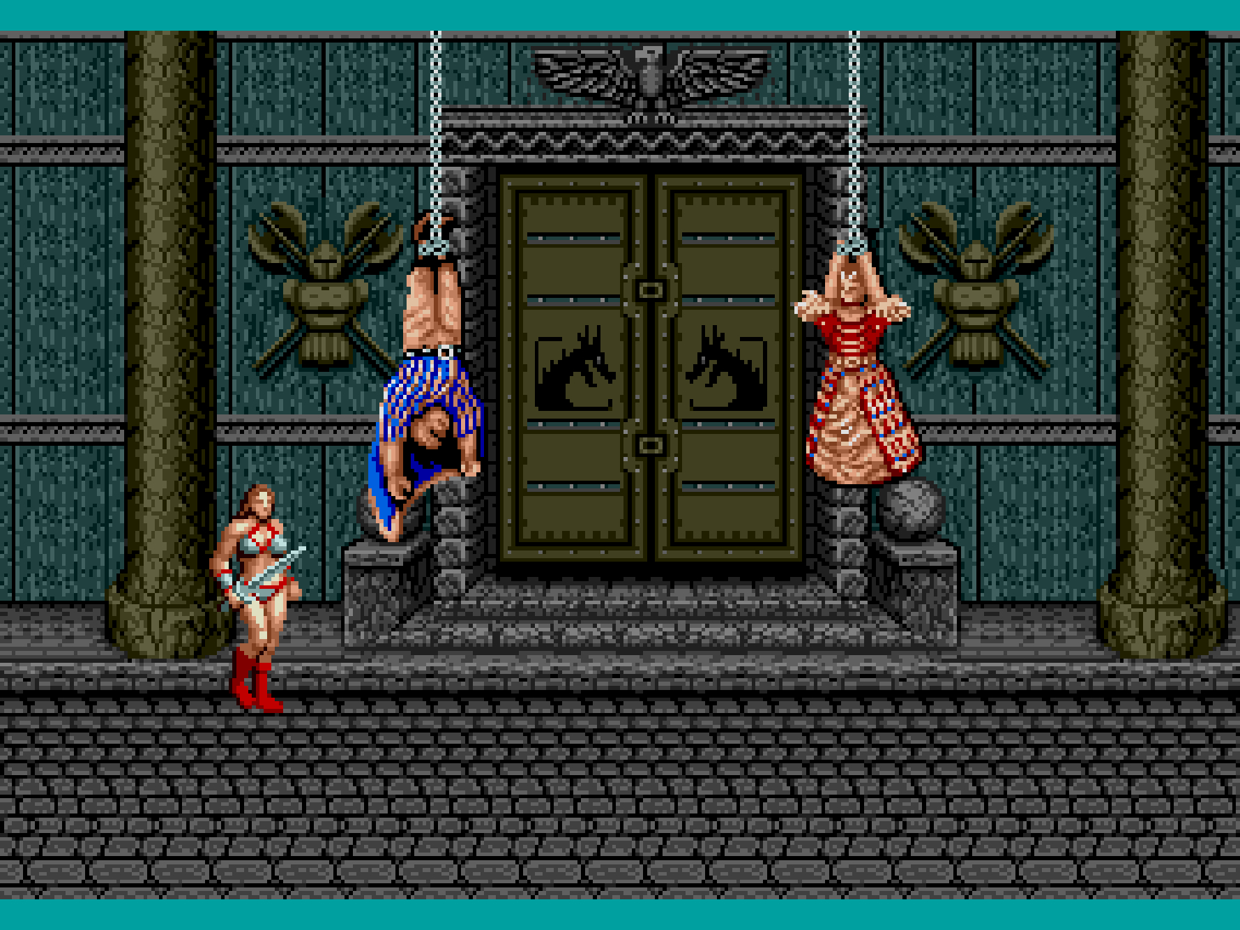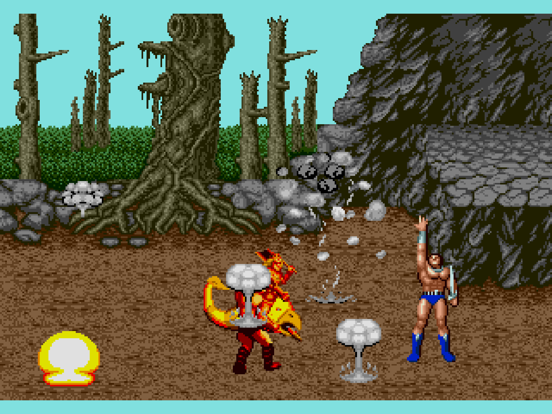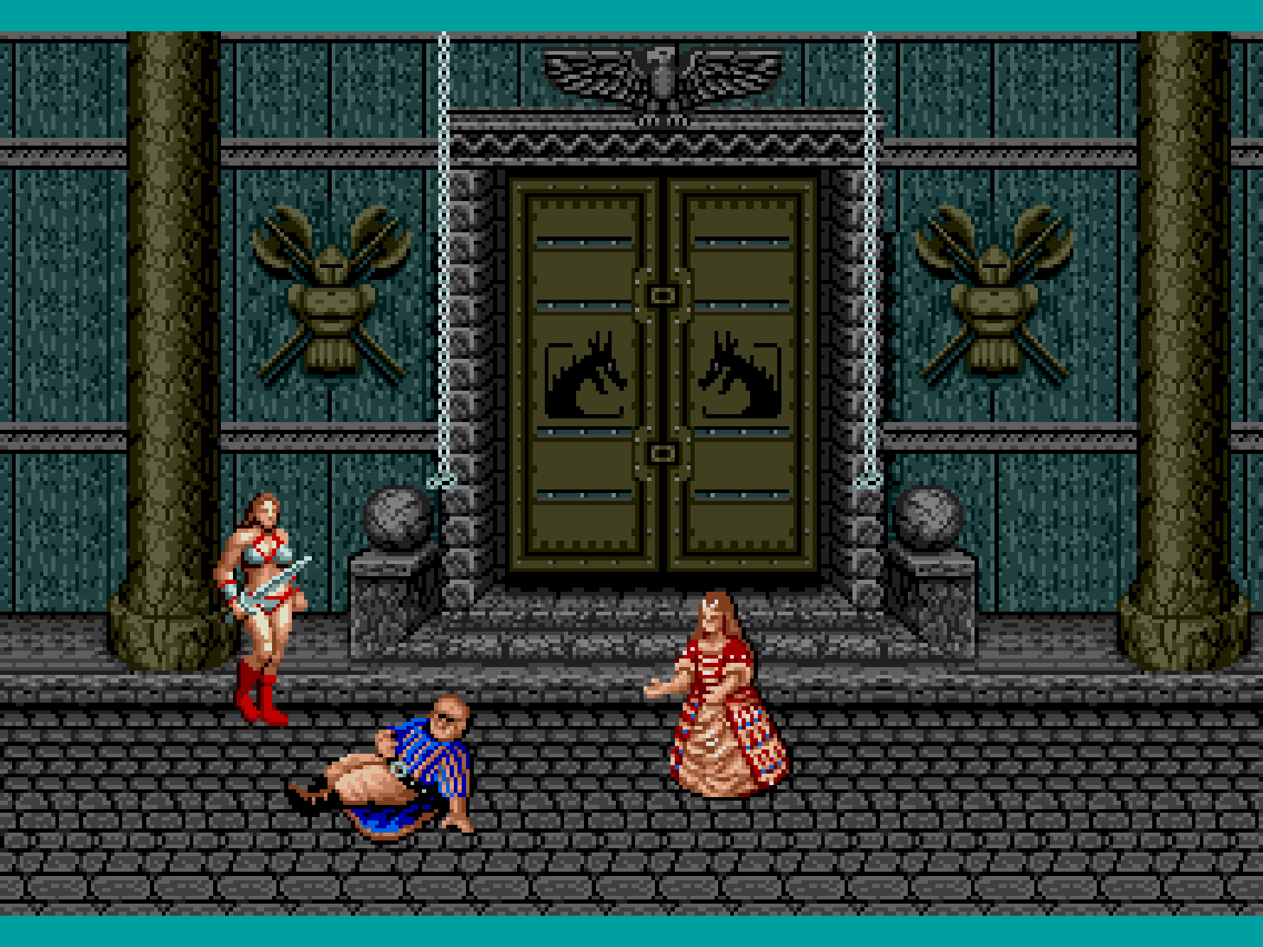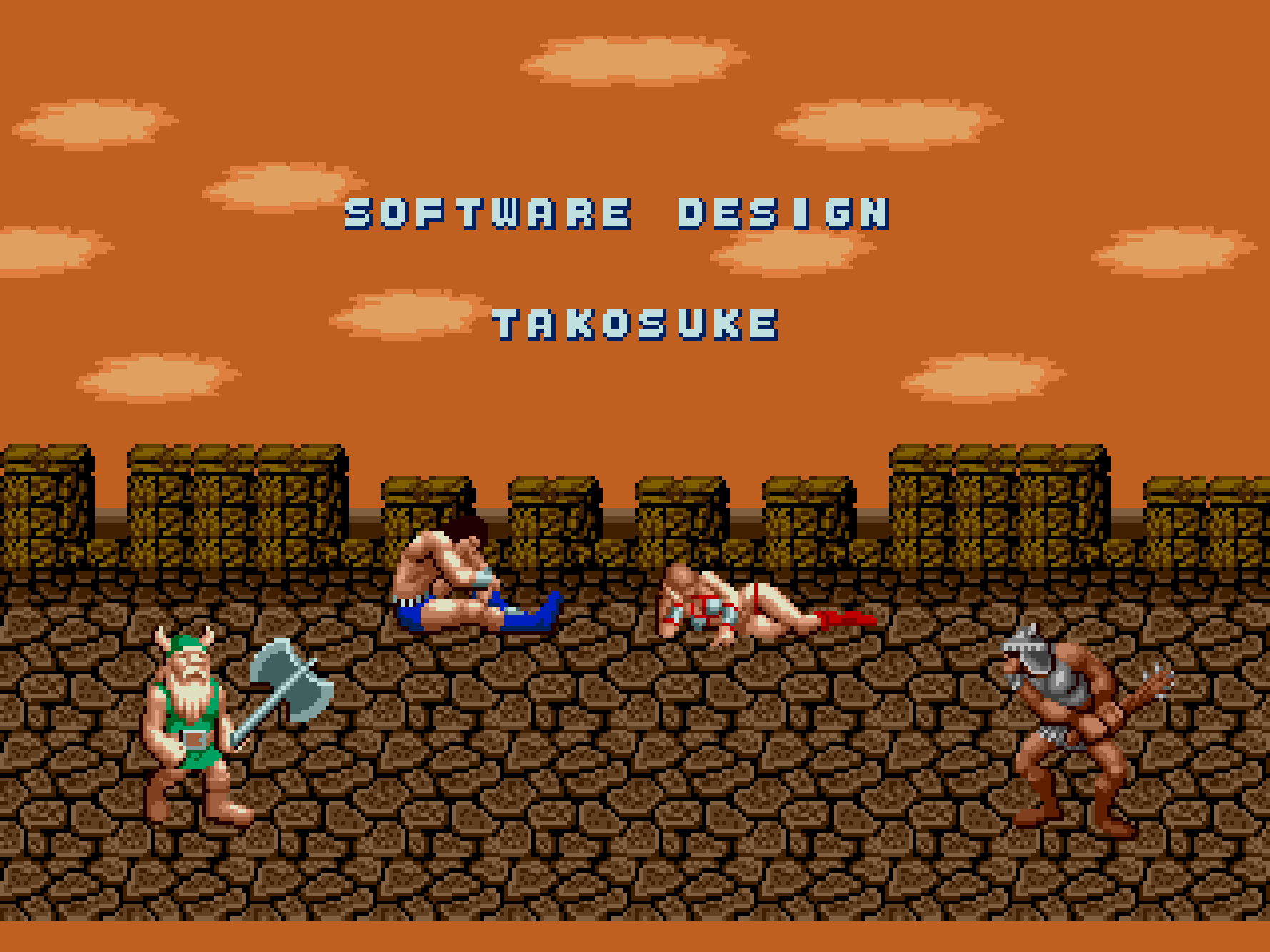 世界観は剣と魔法の王道ファンタジーなんですけど、剣1本だけを持った青パンツ一丁のムキムキな男、非常に露出度の高い服(いわゆるビキニアーマー)を着て半ケツ状態で飛び蹴りを繰り出す女性(半裸)は、当時ゲーム性よりもデザイン面でかなりのインパクトを与えました。